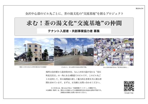 金沢中心部のビル丸ごとに、茶の湯文化の“交流基地”を創るプロジェクト 場所は金沢駅から徒歩約10分。なんと8本の道が交わる「安江町北交差点」の一角にある4階建てのビルです。このビル丸ごとを活用して、茶の湯関連の新しく魅力的な事業を共に創る仲間を求…