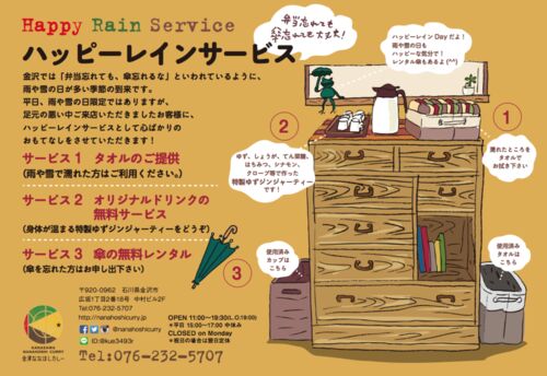 金澤ななほしカレーでは、雨と雪の日が多くなるこれからのシーズンに「心ばかりの3つのおもてなし」をご用意して、ご来店をお待ちしています。 (雨や雪の日には・・)1=ご来店の際、タオルを自由にお使いください。2=身体が温まる「ゆずジンジャーティー…