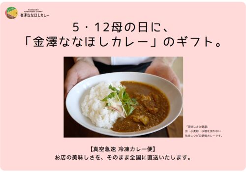 母の日に、ちょっと気の利いた贈り物をお探しならば、「金澤ななほしカレー」のギフトはいかがでしょうか。 金澤ななほしカレーは美味しいだけではなく、栄養バランスにすぐれ、消化もよく、辛さや塩分も控えめでやさしい味わいのため、お子様からお年寄りま…